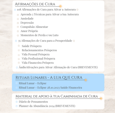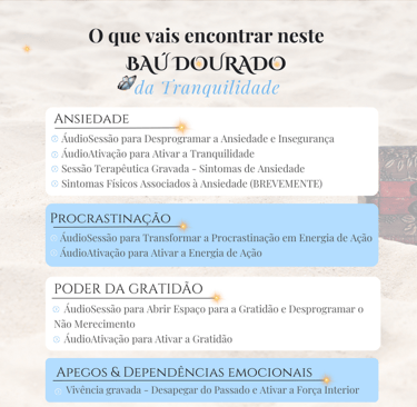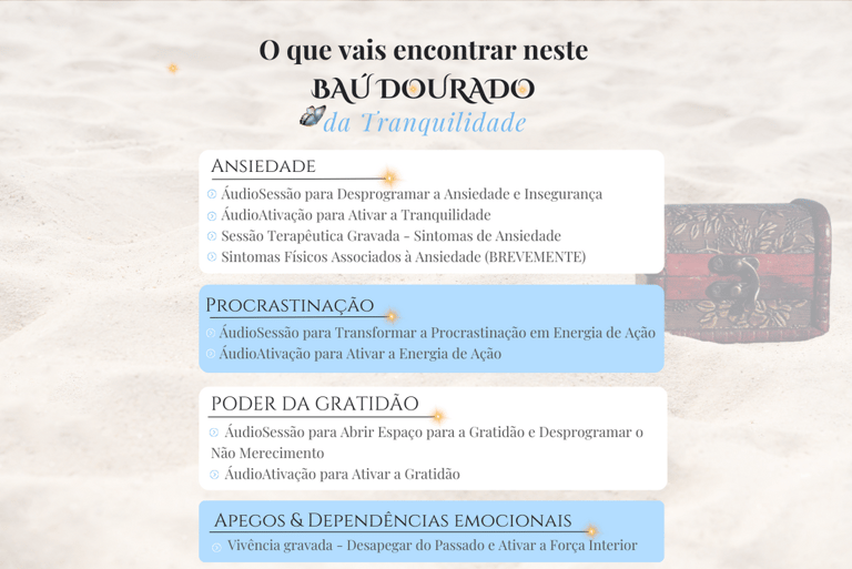 Neste BAÚ vais ter acesso a técnicas, estratégias, aulas, rituais, sessões e áudiosessões, áudioativações e afirmações de cura.